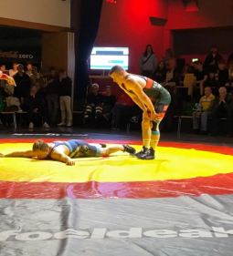 Noah beherrschte seinen Gegner in der Kunst des Griechisch-römischen Stils und gab Adrian keine Möglichkeit einen Punkt zu machen. Nach knapp drei Minuten Kampfzeit beendete Noah mit einer technischen Überlegenheit den Kampf und holte die ersten 4 Mannschaftspunkte.