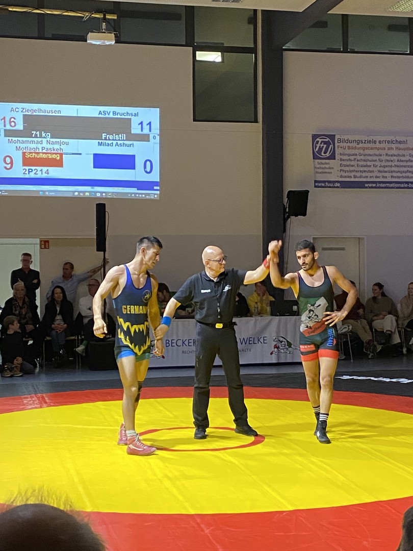 71kg Freistil kam es zum Showdown des Abends. Mohammad Namjou Motlagh (ehemals Mannschaftsringer des SRC Viernheim) traf auf Magomed- Surkho Adaev. Beide Ringer hatten in der Vorrunde keinen Kampf verloren und beide Ringer kämpften bis auf die letzte Sekunde. Mohammad in seiner ruhigen und konzentrierten Art holte verdient einen Punktsieg von 2:5 und verbuchte weitere 2 Mannschaftspunkte auf das Konto des AC.